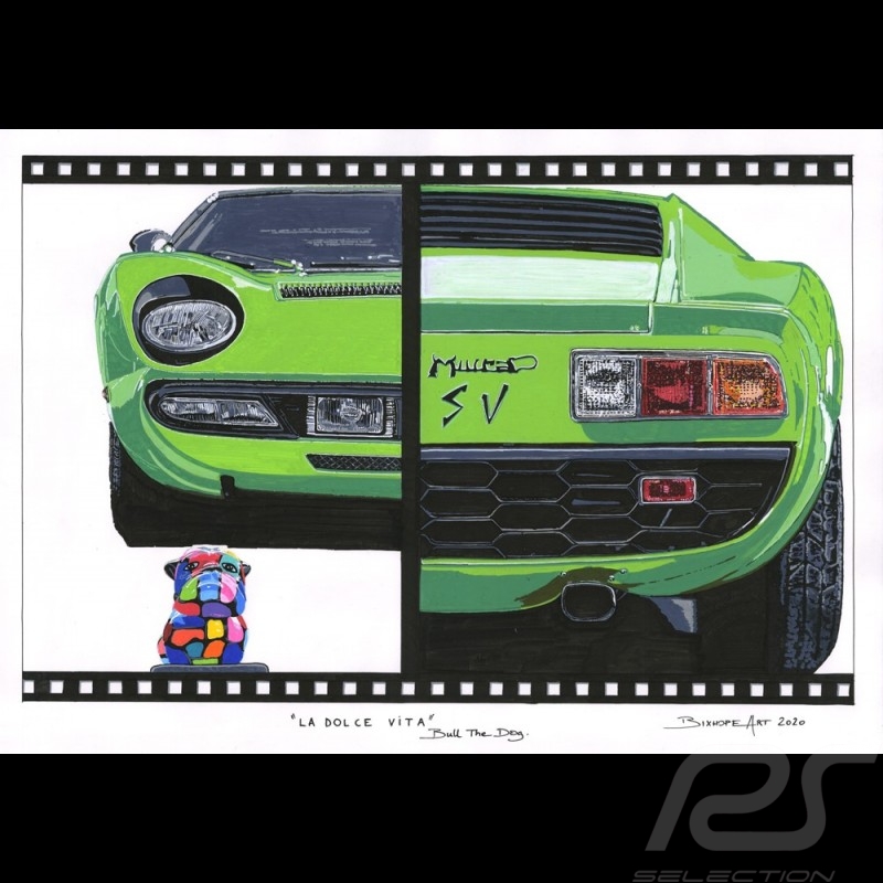 Lamborghini Miura "Dolce Vita" Bull the Dog Reproduktion eines Originalgemäldes von Bixhope Art