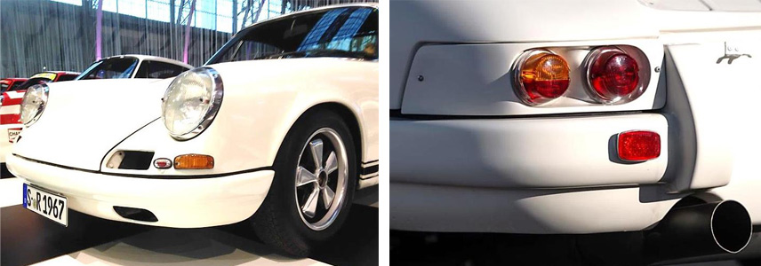 | - Es ist möglich, den Kraftstofftank in der Mitte der Motorhaube zu befüllen, um das Befüllen zu beschleunigen. - Das Motorabdeckungsgitter wird durch ein einfaches schwarzes Gitter ersetzt. - Die hinteren Kotflügel sind verbreitert, um breitere Felgen aufzunehmen. - Je zwei Abgasauslässe praktisch unter jedem Stoßfänger angeordnet. - Zwei Gummi-Sicherheitsclips sichern die hintere Abdeckung. - Schlichte schwarze Beklebung der Schriftzüge "PORSCHE" und "911R" auf der Heckhaube. - "PORSCHE" Schriftzug in Schwarz an den Seiten. - Geschmiedete Fuchs-Leichtmetallfelgen, 6Jx15'' vorne und 7Jx15'' hinten mit 185HR15-Reifen. |