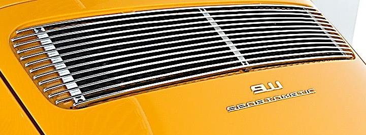 - Der „PORSCHE“-Schriftzug und das „912“-Emblem auf der Heckhaube sind in Silber (optional in Gold) ausgeführt. |