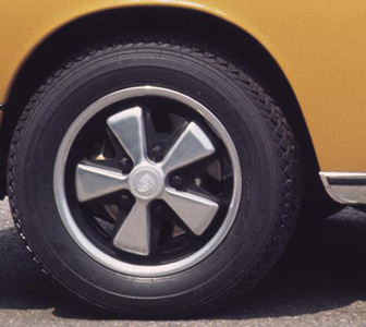 - Serienmäßig geschmiedete Fuchs-Leichtmetallfelgen (schwarz und chrom statt metallfarben) 5,5 J x 15 mit 165VR15-Reifen. |