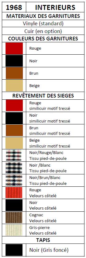 | Innen Details : - Das Armaturenbrett ist aus gebürstetem Aluminium oder Vinyl in Flechtoptik oder sogar Vinyl in Cracked-Optik (ziemlich selten). - Die Tasten auf dem Armaturenbrett sind jetzt mit Gummi überzogen. - Die Beschriftung der Instrumente wechselt von grün auf weiß und die Zähler sind schwarz statt chrom umrandet. - Der Lenkradkranz ist mit Leder bezogen (Holz ist optional immer möglich). - Die Innenverkleidung der Türen ist spezifisch für den Jahrgang 1968 mit einer starren Tasche unter der Armlehne (früher war die Tasche flexibel und nahm die gesamte Breite der Tür ein). Auf der Beifahrerseite befindet sich ein Haltegriff. |