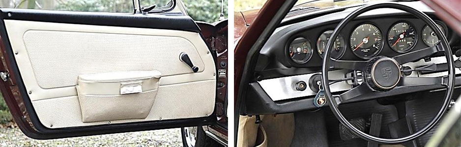 | Außen Details : - Gewölbtes Scheinwerferglas, ohne oberen Rand mit zwei Einstellschrauben, außer 911S. - Schwarze Scheibenwischer nach links im Stand. - Die Stoßstangen und Overrider sind identisch mit denen des Jahrgangs 1967. - Die Fensterrahmen sind nicht mehr verchromt, sondern in glänzend eloxiertem Aluminium. - Chrom-Außenspiegel, rund, immer noch Durant-Marke, aber etwas größer im Durchmesser mit breiterem Rand als zuvor. In Deutschland und den USA werden sie aufgrund der als zu klein empfundenen Fläche während des Jahrgangs durch ein rechteckiges Modell ersetzt, ähnlich dem, das später die 911 von 1972 und 1973 ausstatten wird. |