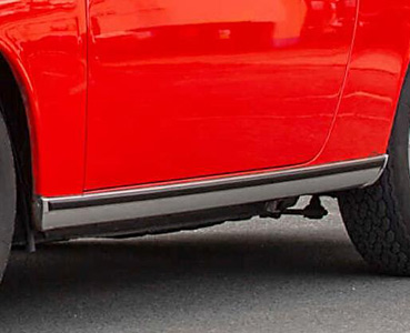 - "PORSCHE" Schriftzug und „911 T“ Emblem in Silberfarbe (Gold als Option). - Die verchromten Schwellerleisten decken die Drehstababdeckung nicht ab. - 4,5Jx15 Stahlfelgen mit 165HR15 Bereifung (Fuchsfelgen optional). |