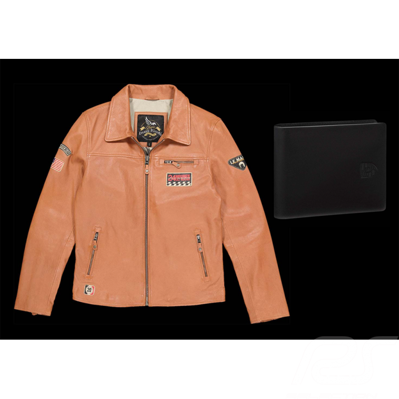 Duo Lederjacke Steve McQueen 24H Du Mans Lewis Havane + Porsche Geldbörse schwarze Leder Wappen WAP0300310K