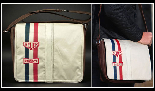Sac reporter Gulf Bandoulière 1 grande poche zippée, 1 petite poche à l'intérieur 2 grandes poches sous rabat, 1 grande poche zippée au dos Logos Heuer brodé Bandes décoratives cuir 2 poches intérieures pression / zip Bandoulière cuir réglable Couleur beige / bandes rouge et bleu Matière 80% Cuir / 20% Coton / Doublure 100% Coton LxHxP : 38 x 33 x 10 cm 139 € TTC / Incl. Taxes