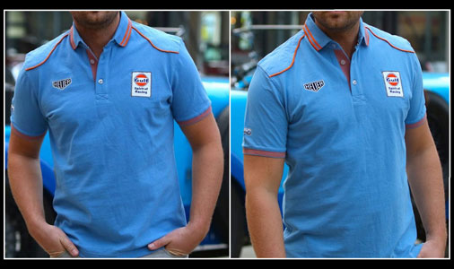 Polo homme Gulf - Spirit of Racing Coupe moulante et esprit course Ecussons brodés vintage sur la poitrine Renfort matelassé sur les épaules liseré orange Col rayures orange maille fine Couleur : bleu cobalt 100% coton 69,90 € TTC / Incl. Taxes