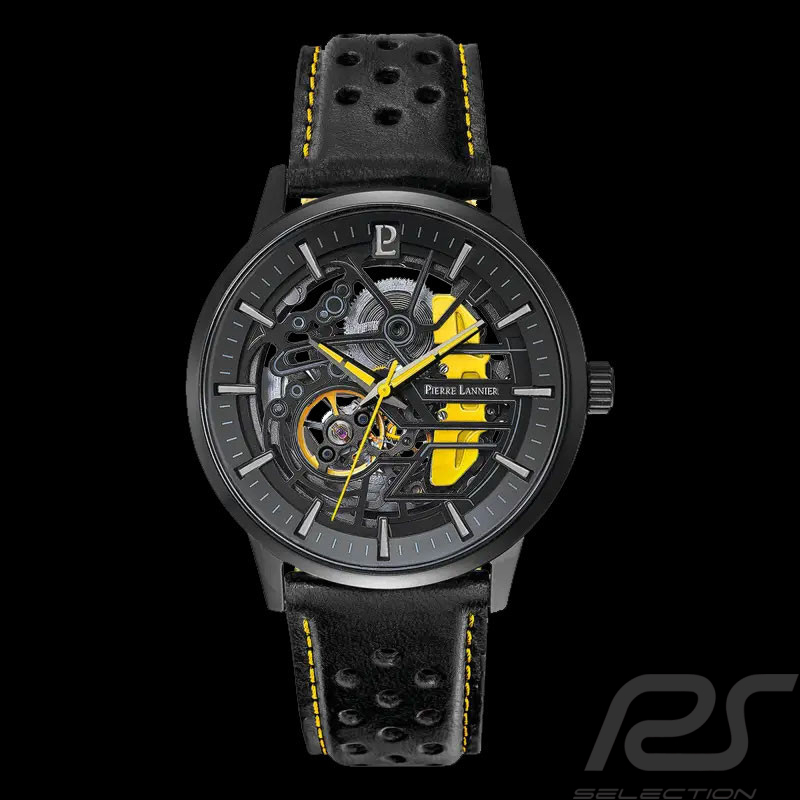 Paddock Automatic Watch Black / Yellow Leather bracelet Made in France Pierre Lannier 338A443