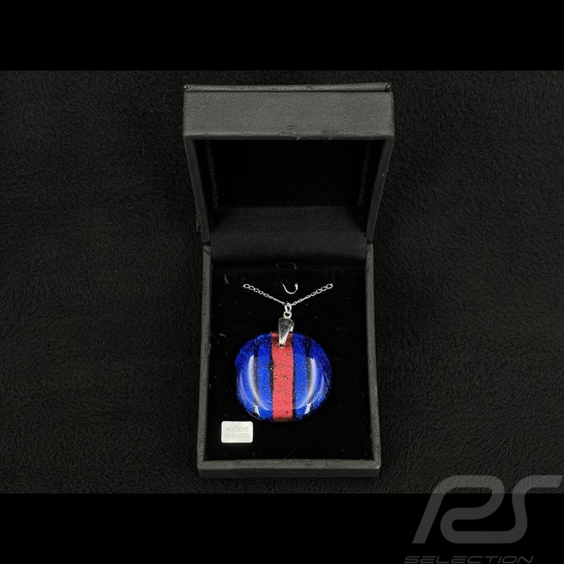 The idea to make customized jewellery for motor-sport enthusiasts came while glass-artist, Sue Corfield, was reflecting on how much nice clothing there is for avid fans, yet there was absolutely nothing in the way of high-quality, customised jewellry for ladies who wanted something original to wear. In her glass-working studio, she created a necklace in the Martini colours, wanting it to be an elegant, sophisticated fusion of the iconic blue, navy and red. To create this pendant, she selected dichoric glass, which was initially used in the space industry, and uses glass treated with various metal oxides. The glass is fused at high temperature in a glass kiln, and the resulting pendant is composed of two layers, whereby the dichoric layer displays subtle sheens and reflections, which vary depending on the angle you view it from. Combining the classic Martini colours, the resulting pendant is both eclectic and intriguing, while the annealing process guarantees it is absolutely individual piece of glass art, no two will ever be the same. Mounted on a 925/1000 silver chain, 44 cms in length.