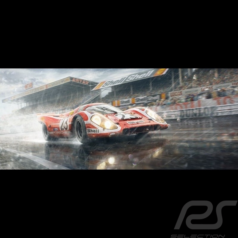 Ce travail d'une grande qualité représente une Porsche 917K, pilotée par Hans Hermann, roulant sous le déluge pendant les 24 Heures du Mans 1970.