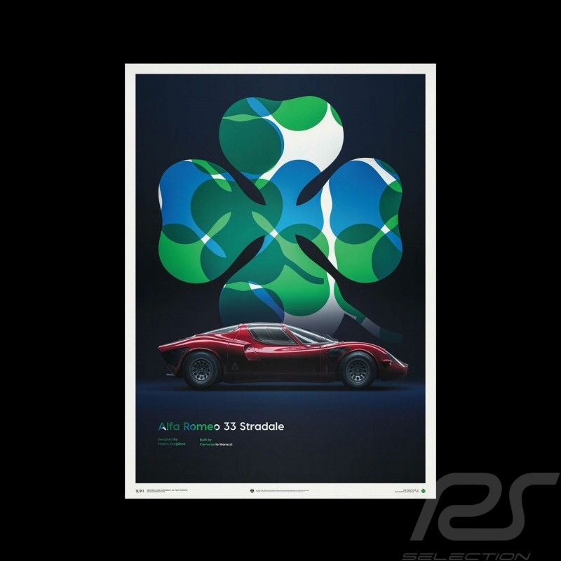 Cette affiche Alfa Romeo 33 Stradale de la collection Design Poster présente l'une des plus belles voitures de course italiennes homologuées pour la route. La 33 Stradale, construite pour la première fois en 1968, était basée sur la voiture de course Autodelta Alfa Romeo Tipo 33. La voiture, conçue par Franco Scaglione et construite par la Carrozzeria Marazzi, a fait ses débuts au salon de l'automobile de Turin en 1967.