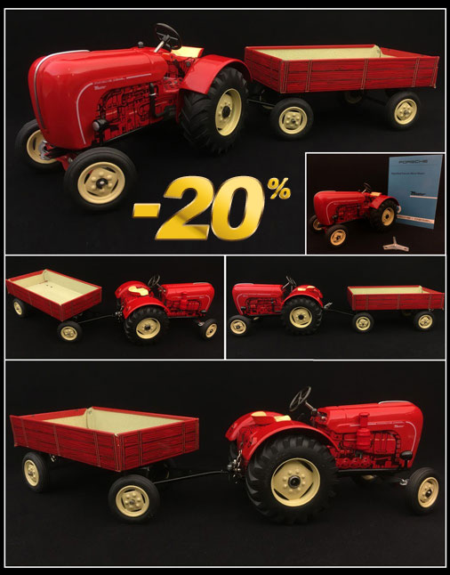 Tracteur Porsche Diesel Master 419 avec Remorque Jouet tôle avec mécanisme - Remontoir à clé - Roues directrices Frein à main et boîte de vitesse fonctionnelle : 3 marches avant - 1 marche arrière Avec livret historique - Rouge 1/25 - Kovap 0321