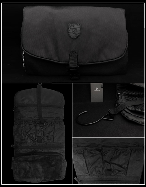 Trousse de toilette Porsche Ecusson Crochet de suspension intégré - Matière Nylon Polyester - Doublure en Polyester 2 grandes poches zippées - 1 poche filet zippée - 5 compartiments élastiqués Couleur noir - Dimensions 18 x 27 x 3 cm Porsche Design WAP9100070K0SR