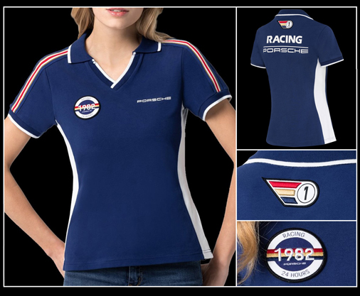 Polo femme Porsche 956 - 24h Le Mans 1982 Matière 95% Coton / 5% Elasthanne - Couleur Bleu / Détails Blanc / Rouge / Or Porsche WAP452NRTM 84,95 € TTC / Incl. Taxes