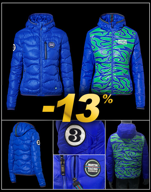 Veste réversible femme Porsche Martini 917 Collection Veste matelassée réversible avec capuche - Matière 100% nylon / polyester Couleur bleu / vert psychédélique - Détails inspirés de la Porsche 917 LH Le Mans 1970 n° 3 Badge avec numéro 3 sur la manche - Pins 917 et bandes tricolores Porsche WAP558LMRH