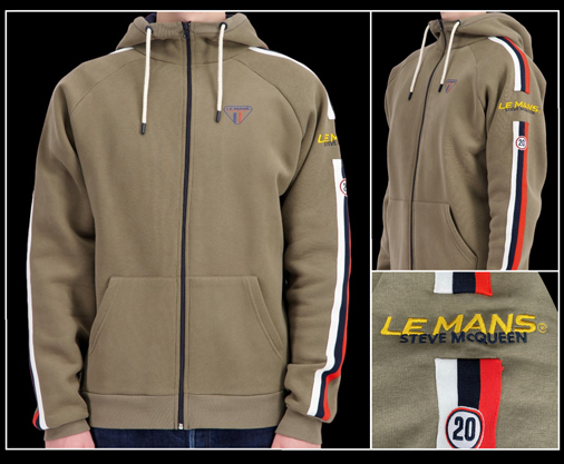 Hoodie homme 24h Le Mans Steve McQueen Fermeture zippée - Matière 80% Coton / 20% Polyester - Couleur Vert Kaki Capuche réglable par cordon - 2 poches centrales 24h Le Mans SQ241SSM01-324 119,95 € TTC / Incl. Taxes