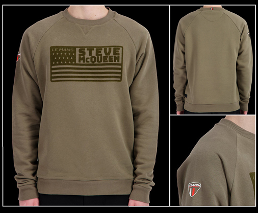 Sweatshirt homme 24h Le Mans Steve McQueen Matière 70% Coton / 30% Polyester - Couleur Vert Kaki - Poignets / Col / Bords cotelés 24h Le Mans SQ241SSM03-324 84,95 € TTC / Incl. Taxes