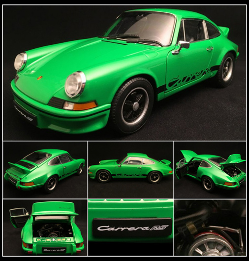 911 2.7 Carrera RS 1973 Vert vipère / Bandes noires 1/18 - Welly 18044 Intérieur reproduit fidèlement Compartiment moteur détaillé Coffre, portes et capot ouvrants 49,95 € TTC / Incl. Taxes