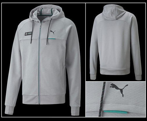 Hoodie homme Mercedes-AMG Petronas F1 by Puma Fermeture par zip - Capuche réglable par cordon de serrage - 2 Poches latérales Matière 60% Coton / 40% Polyester - Couleur : Gris Puma 534906-02 99,95 € TTC / Incl. Taxes