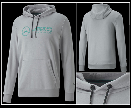 Hoodie homme Mercedes-AMG Petronas F1 by Puma Capuche réglable par cordon de serrage - Poche kangourou Matière : 68% coton / 32 % polyester - Couleur : Gris Puma 535219-02 69,95 € TTC / Incl. Taxes
