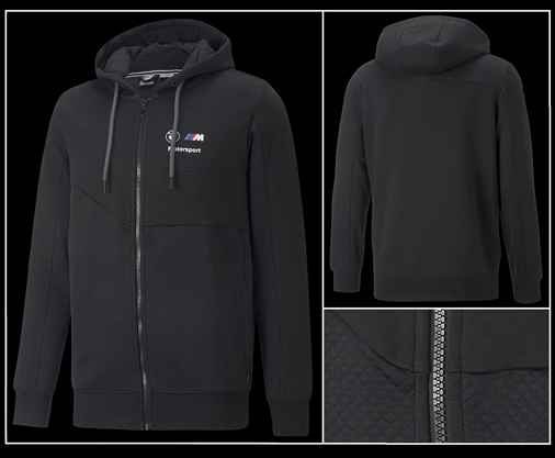 Hoodie homme BMW Motorsport by Puma Capuche réglable par cordon Couleur Noir - Matière : 77% coton / 23% polyester Fermeture par Zip - Poignets et taille côtelés - 2 Poches latérales Puma 535864-01 99,95 € TTC / Incl. Taxes