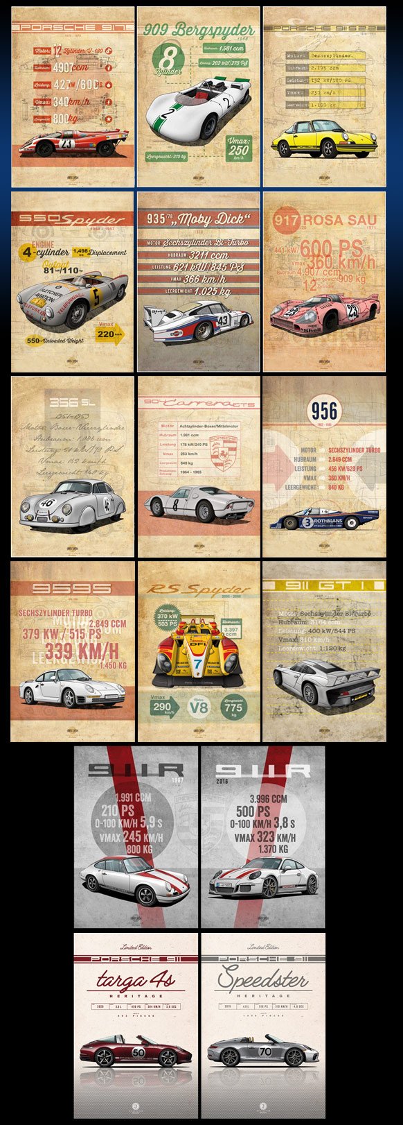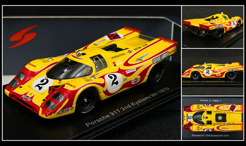 La 917 rejoint ainsi une longue et prestigieuse lignée de spyder Porsche, qui a débuté avec la 550 et trouve son aboutissement avec la 908 /03 victorieuse à la Targa Florio en 1970. A l'origine la 917 spyder, légère et maniable, manque un peu de puissance face à ses concurrentes, en particulier dans les course de CanAm. Porsche réagit immédiatement et prend le pari de la suralimentation. La 917 devient la toute première voiture de course utilisant la technologie du turbocompresseur. Et le pari se révèle gagnant au-delà de toute mesure : les 917 /10 puis 917 /30 avec leur double turbo (un par rangée de cylindres) développent plus de 1000 CV et sont les voitures les plus puissantes jamais alignées en course.