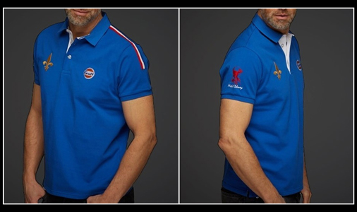Polo Homme Gulf Le Mans 1970 Signature Michael Delaney personnage du film Le Mans Bande tricolore sur l'épaule gauche - Couleur bleu roi Col rugby en Twill - Matière 100% coton
