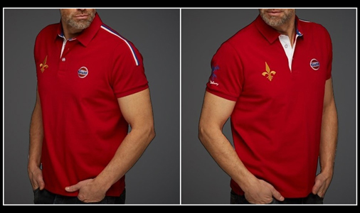 Polo Homme Gulf Le Mans 1970 Signature Michael Delaney personnage du film Le Mans Bande tricolore sur l'épaule gauche - Couleur rouge Col rugby en Twill - Matière 100% coton