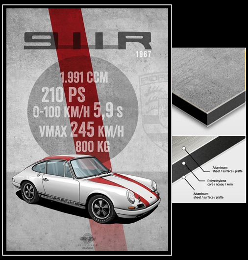 Reproduction d'un dessin original de Helge Jepsen Porsche 911 R 1967 - 40 x 60 cm - Impression sur plaque d'aluminium Kit d'accrochage vendu séparément 59,95 € TTC / Incl. Taxes