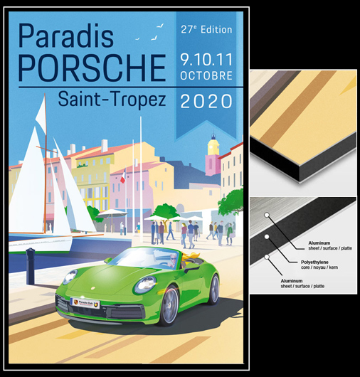 Reproduction de l'affiche originale du Paradis Porsche Saint Tropez 2020 40 x 60 cm - Impression sur plaque d'aluminium Kit d'accrochage vendu séparément 59,95 € TTC / Incl. Taxes