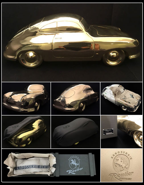 Sculpture Porsche 356 Jubilée Karosserie Reutter Anniversaire des 111 ans de l'entreprise de Stuttgart Bronze doré / Argent 1/10 - Reutter AA0110 Edition limitée - 111 exemplaires numérotés Matière : Bronze - Poids : 3.5 kg Boite en bois avec couvercle coulissant Housse de protection Reutter Karosserie 999,95 € TTC / Incl. Taxes