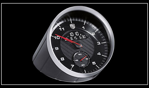 Horloge de Table Porsche 911 Chrono Fonction réveil et compte à rebours Cadran avec insert en carbone véritable Affichage de l'heure analogique et numérique Dimensions 11,5 cm Couleur noir / carbone Porsche Design WAP0701010G 229,95 € TTC / Incl. Taxes