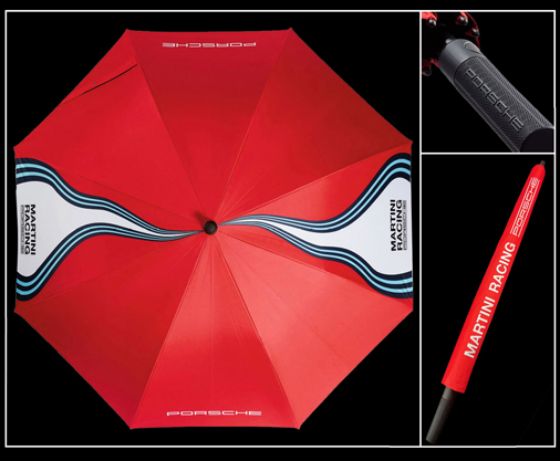 Parapluie XL Porsche Martini Racing Système coupe-vent avec baleines en fibre de verre - Ouverture automatique Diamètre ouvert 130 cm - Longueur fermé 88 cm Couleur Rouge / Bleu / Blanc - Housse de rangement Porsche WAP0500570P0MR 94,95 € TTC / Incl. Taxes