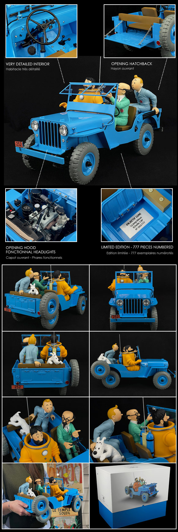 Tintin Objectif Lune - Jeep Willys MB Comprend les figurines Professeur Tournesol, Capitaine Haddock, Milou, Tintin Phares lumineux (piles 3 x LR44 1,5V non fournies) - Modèle en métal et plastique Dimensions 27 x 41 x 22.5 cm - Poids 4.8 Kg Bleu 1/8 - Tintinimaginatio 44300 Edition Limitée - 777 exemplaires numérotés avec certificat d’authenticité 1994,95 € TTC / Incl. Taxes