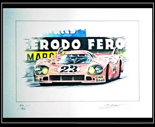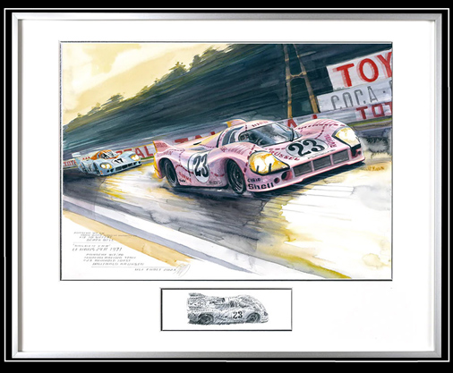 Reproduction d'un dessin original de Uli Ehret Porsche 917 Pink Pig n°23 - 24h Le Mans 1971 40 x 50 cm - Avec cadre bois peint, double passe-partout et verre de protection Edition limitée - 100 exemplaires numérotés et signés 149,95 € TTC / Incl. Taxes