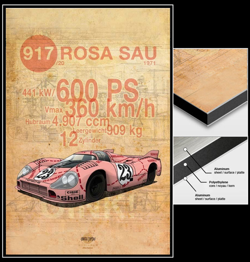 Reproduction d'un dessin original de Helge Jepsen Porsche 917 Pink Pig n°23 - 24h Le Mans 1971 40 x 60 cm - Impression sur aluminium Kit d'accrochage vendu séparément 59,95 € TTC / Incl. Taxes