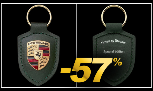 Porte-clés Ecusson Porsche Pièce de Cuir de 7 cm avec contour piqué - Couleur Vert Chêne - Anneau doré Ecusson céramique et métal de 3 cm - Dimensions 8 x 4,1 x 0,8 cm Porsche WAP0503550RWSA