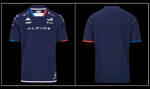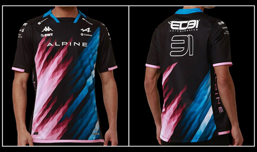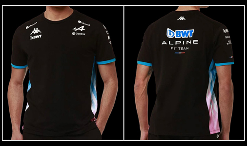T-shirt homme Esteban Ocon Alpine F1 2024 Couleur Noir / Bleu / Rose - Matière 100% Polyester Kappa 321R78W-A01 74,95 € TTC / Incl. Taxes
