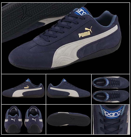 Chaussures homme Sparco Speedcat by Puma Matière Cuir velours - Semelle extérieure caoutchouc profil bas Talon de pilote arrondi - Couleur Bleu Marine / Blanc Puma 307171-06