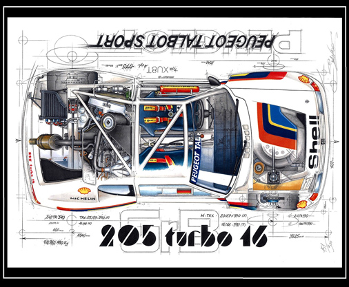 Reproduction d'une peinture originale de Sebastien Sauvadet Peugeot 205 Turbo 16 Gr.B Talbot Sport 30 x 40 cm - Papier 250 g/m2 29,95 € TTC / Incl. Taxes