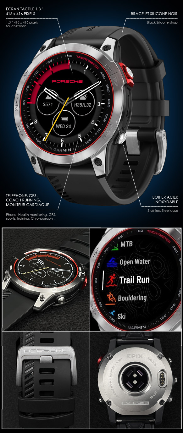 Montre Connectée Porsche Smartwatch Garmin Epix 2 Boitier Acier Inoxydable - Écran tactile 3.3 cm (1,3") - Chronographe et Tachymètre Bracelet silicone - Connectivité GPS / Bluetooth / Wi-Fi / ANT+ - Mémoire 16 GB Fonctions : Téléphone, Géolocalisation, Sports Trainer, Musique, Capteur cardiaque ... Autonomie jusqu'à 16 jours - Couleur noir et acier / bracelet noir - Poids 76g OS Android Wear, compatible iOS - Livré avec chargeur, câble USB, documentation Etanche 10 ATM - Porsche WAP0709010PSMW 994,95 € TTC / Incl. Taxes