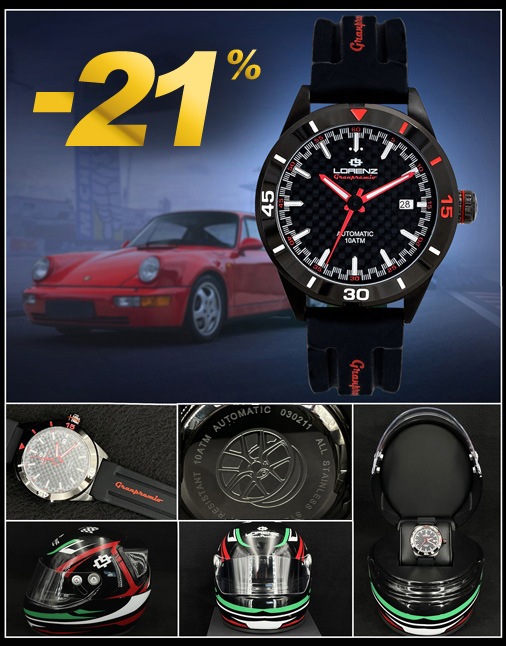 Montre Automatique Lorenz Granpremio Mouvement automatique Seiko NH35 - Bracelet en silicone noir, inscription rouge Cadran en acier ip gunmetal - Diamètre 42 mm - Verre minéral de haute qualité Fermoire par boucle en acier - Livret d'instructions et Etuis spécial en forme de casque inclus Etanche 10 ATM - Couleur : Noir / Rouge Lorenz 030211CC