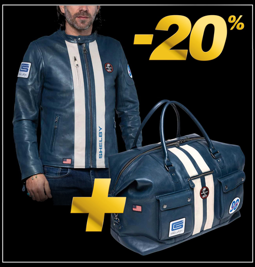Duo Veste homme + Sac de Voyage en cuir Shelby Cobra Matière 100% cuir - Doublure 100% Coton - Couleur Bleu Royal 2 poches latérales - 1 poche poitrine - 2 poches intérieures Dimensions sac 54 x 47 x 24 cm - Poid sac 1,4 kg Classic Legend Motors 27428-0012
