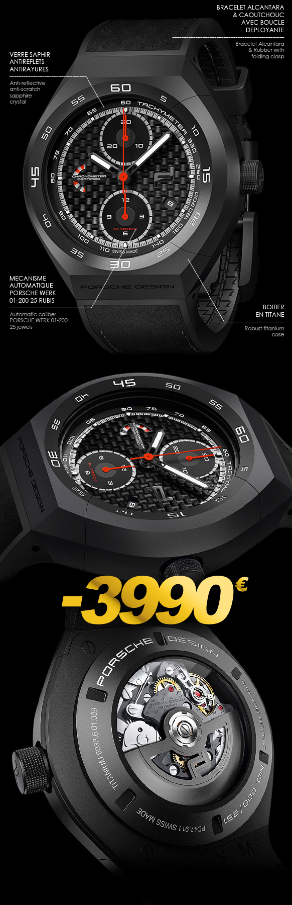 Montre automatique Porsche 911 RSR Chronotimer Flyback Chronographe avec interrupteur à bascule multifonction - Boîtier noir en titane Calibre Porsche Design Werk 01-200 25 rubis - Rotor tungstène à optimisation d’énergie Revêtement carbure de titane - Verre saphir - Bracelet caoutchouc et alcantara Diamètre 45,5 mm - Fabriqué en Suisse - Garantie 2 ans - Boîtier étanche 10 ATM Coffret de présentation luxueux en bois - Série limitée à 251 exemplaires Porsche Design 4046901810504