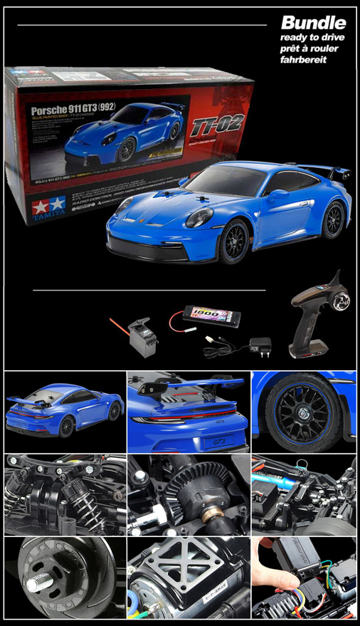Kit Porsche 911 GT3 2021 Radiocommandée Kit complet à monter chassis + carrosserie - Moteur type 540 et variateur inclus Châssis TT-02 à transmission intégrale par cardans - Jantes à rayons moulées Pare-choc mousse - Pack d’accus et chargeur inclus - Equipement RC inclus Carrosserie polycarbonate prépeinte en PS-30 Bleu Vif 1/10 - Tamiya 47496 249,95 € TTC / Incl. Taxes
