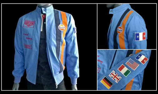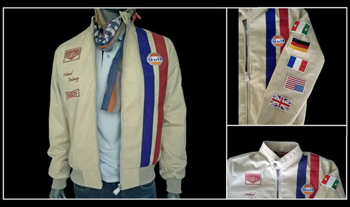 Veste Homme Gulf Steve McQueen Avec 5 drapeaux brodés interchangeables en haut de manche : France, Italie, USA, GB, Allemagne Couleur : beige Matériel : 100% Coton Doublure intérieure : 100% Nylon Blouson taillé près du corps Tirette de la fermeture éclair en forme de pédale d'accélérateur Poche intérieure avec l'impression 917 issu du film 169,90 € TTC / Incl. Taxes