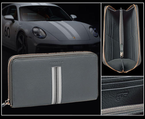 Portefeuille en Cuir Porsche 911 Sport Classic 1 compartiment principal zippé - 1 poche monnaie zippée Compartiments pour billets, tickets, cartes de crédit, etc Couleur Gris Anthracite - Matière Cuir - Dimensions 19 x 11 x 2 cm Porsche WAP0300340PHRT 149,95 € TTC / Incl. Taxes
