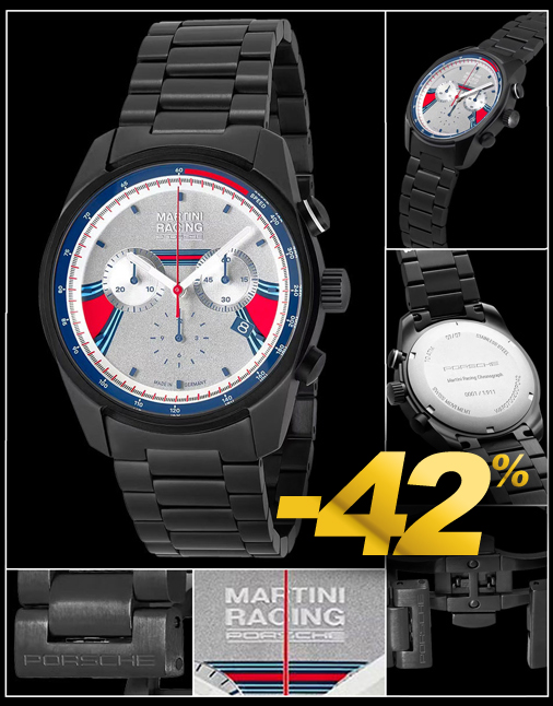 Montre Porsche Chrono Sport Martini Racing Mouvement Suisse RONDA 13 rubis - Bracelet en acier inoxydable avec liens brossés et polis Aiguilles luminescentes - Dos gravé avec numéro de série - Etanche à 100 mètres / 10 ATM Bracelet en acier inoxydable - Verre antireflets saphir - Fonction Stop intégrée Montage du bracelet et réglage de la longueur par deux goupilles à ressort Diamètre 37 mm - Epaisseur 12 mm - Garantie 2 ans Fabriqué en Allemagne - Porsche WAP0700200P042 We do not ship this product to France Thank you for your understanding