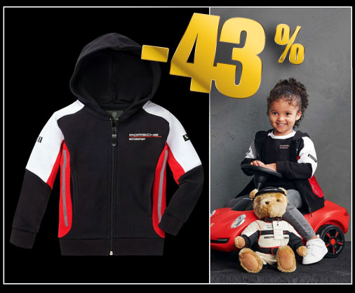 Veste à capuche enfant Porsche Motorsport Collection Bandes réfléchissantes - 2 poches extérieures / 2 poches intérieures Couleur noir / rouge / blanc - Matière 100% coton molleton Porsche WAP432K