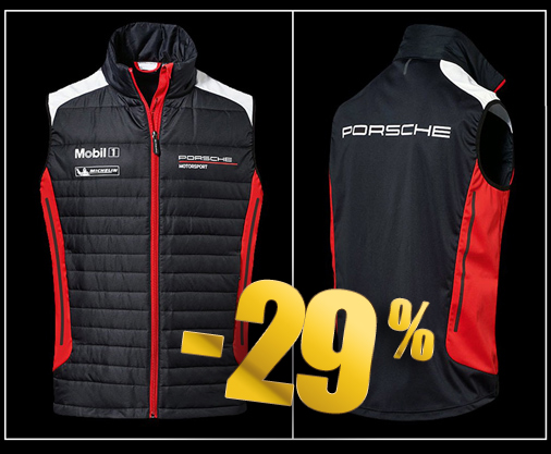 Veste sans manches mixte Porsche Motorsport Collection Couleur noir / rouge / blanc - Matière 100 % polyester Softshell Bouchons d'oreilles - Lanière et chiffon de nettoyage pour lunettes Support fil casque / écouteurs - Porsche WAP804