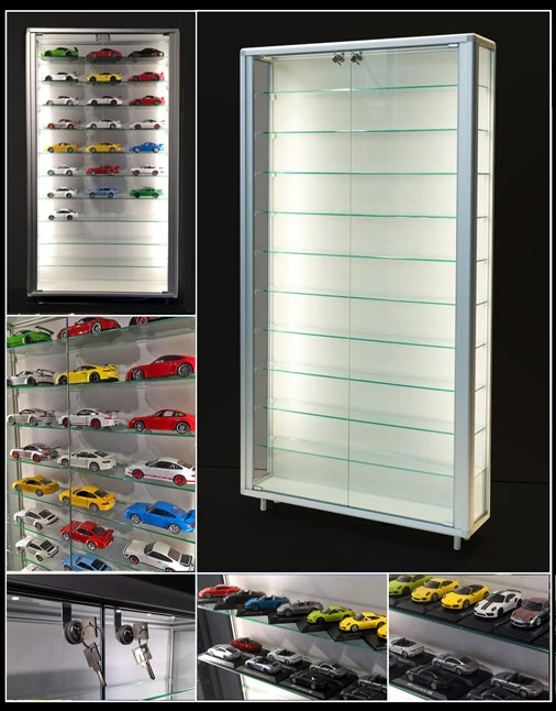Vitrine murale pour miniatures 1/43, 1/18, 1/24 Jusqu'à 264 miniatures à l'échelle 1/43 - 2 portes vitrées avec serrures 10 étagères / 11 niveaux de présentation - En Aluminium et Verre - Avec éclairage LED Dimensions 184,5 x 99 x 23 cm - Fabriqué en Allemagne 1599,95 € TTC / Incl. Taxes